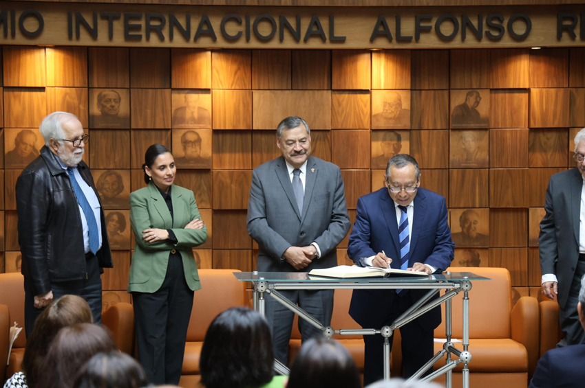 la Secretaría de Cultura del Gobierno de México y el Instituto Nacional de Bellas Artes y Literatura (INBAL), a través de la Coordinación Nacional de Literatura (CNL), en colaboración con el gobierno del estado de Nuevo León y la Secretaría de Cultura estatal, mediante la Universidad Autónoma de Nuevo León (UANL) y la Sociedad Alfonsina Internacional (SAI), entregaron este viernes 15 de noviembre el Premio Internacional “Alfonso Reyes” 2024 al escritor Alberto Enríquez Perea, en la Capilla Alfonsina Biblioteca Universitaria de la UANL. En su intervención, Alberto Enríquez Perea agradeció a las instituciones convocantes y al jurado calificador por la entrega de este reconocimiento, así como a personalidades como Alicia Reyes y Minerva Margarita Villarreal, entre otros personajes quienes facilitaron la labor investigativa sobre Alfonso Reyes. Enríquez Perea recordó que fue en Monterrey, la ciudad natal de Alfonso Reyes, donde el autor de Cuestiones estéticas (1911) tuvo su primer encuentro con los libros, en la biblioteca de su padre, el general Bernardo Reyes, en un época difícil por la posición política de su progenitor: “Tiempos difíciles, de esos que doblan a los hombres, sin embargo Alfonso Reyes sacaba fortaleza de la literatura y, en medio de la tragedia que vivía, llegó su primer libro; y a la muerte de su padre, al enfrentarse con el dictador, al dirigir su rumbo y salir en consecuencia del país, con su esposa, hijo y libros, marcaba ya una nueva etapa de su vida”. Previo a la lectura del acta del jurado del Premio Internacional “Alfonso Reyes” 2024, el secretario de Extensión y Cultura de la UANL, José Javier Villarreal, expresó que Alfonso Reyes es una presencia fundamental de las letras mexicanas, hispanoamericanas y universales, por lo que es en la Capilla Alfonsina Biblioteca Universitaria donde se resguarda su acervo bibliográfico, “tesoro de la nación”, el cual es custodiado por la UANL y fue sede de la entrega de este galardón.